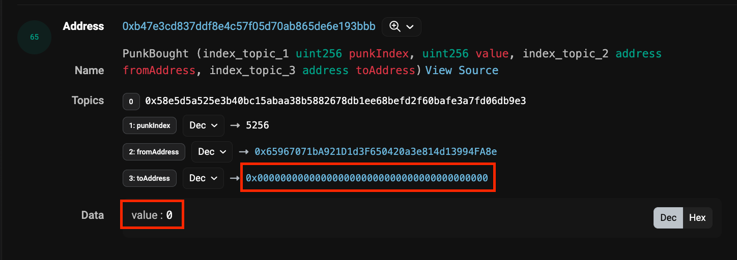 shown as 0. (This only happens when the punk is purchased through acceptBidForPunk)
